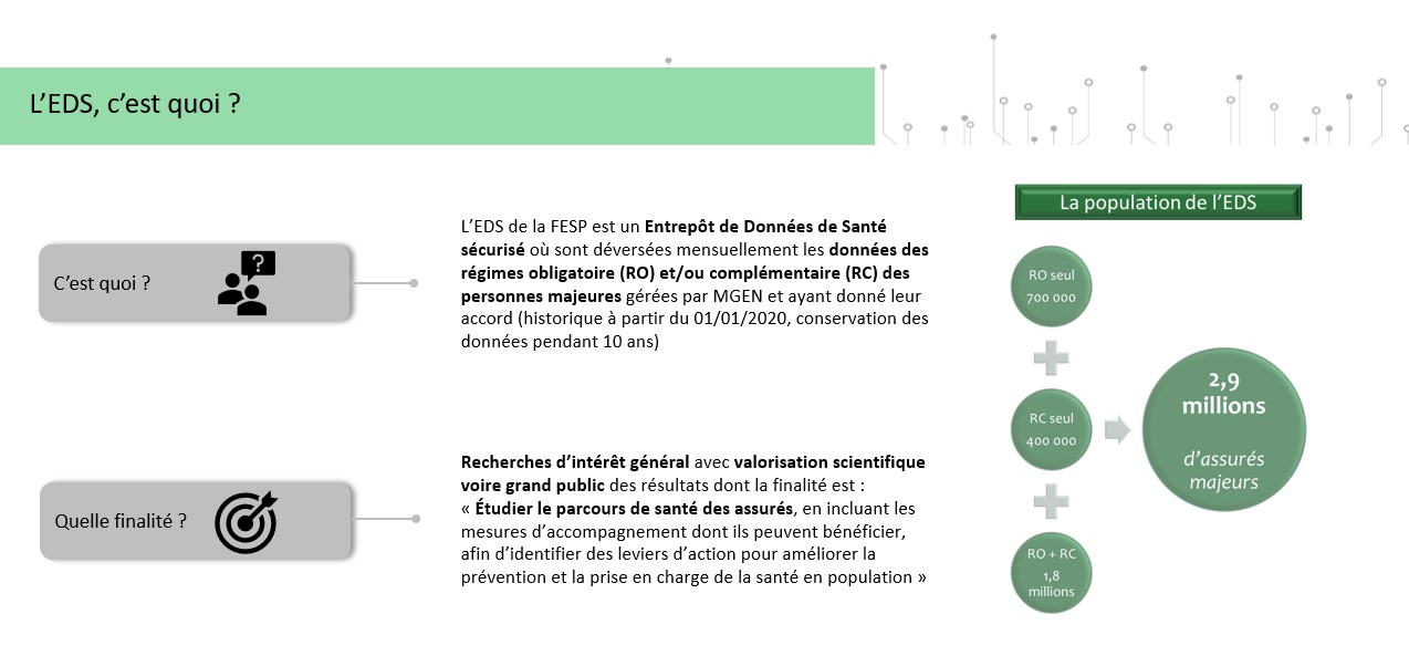 L’EDS de la FESP, autorisé par la Commission Nationale de l’Informatique et des Libertés (CNIL) le 31 décembre 2024 (autorisation n°2235299), contient les données socio-administratives, de remboursements des régimes obligatoire (RO) et complémentaire (RC), et de prestations de prévoyance de près de 3 millions de personnes majeures protégées par MGEN, sauf opposition de leur part.