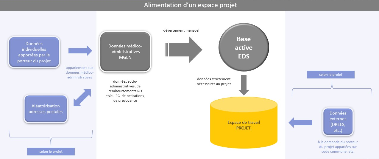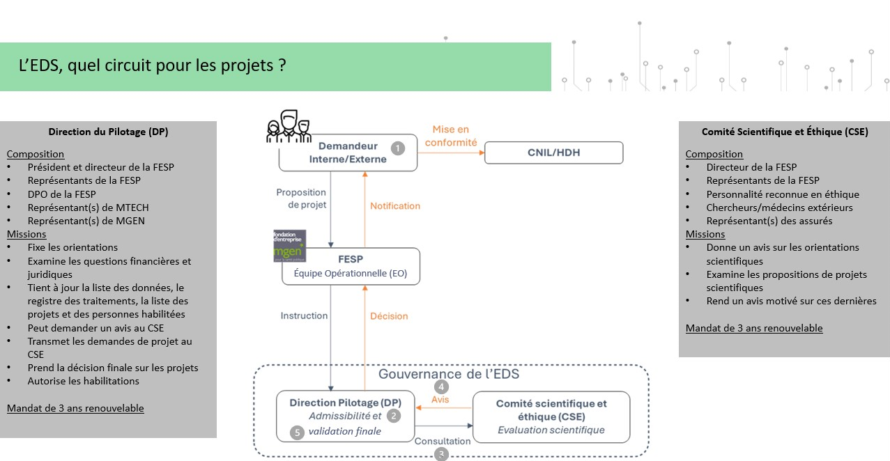 Une Équipe Opérationnelle (EO) assure le fonctionnement de l’EDS et la gestion des projets de recherche en lien étroit avec la DP, le CSE, la DPO, et le service informatique qui assure la partie technique. Elle est joignable pour toute question, notamment sur les données, à l’adresse : eds.fesp@mgen.fr.