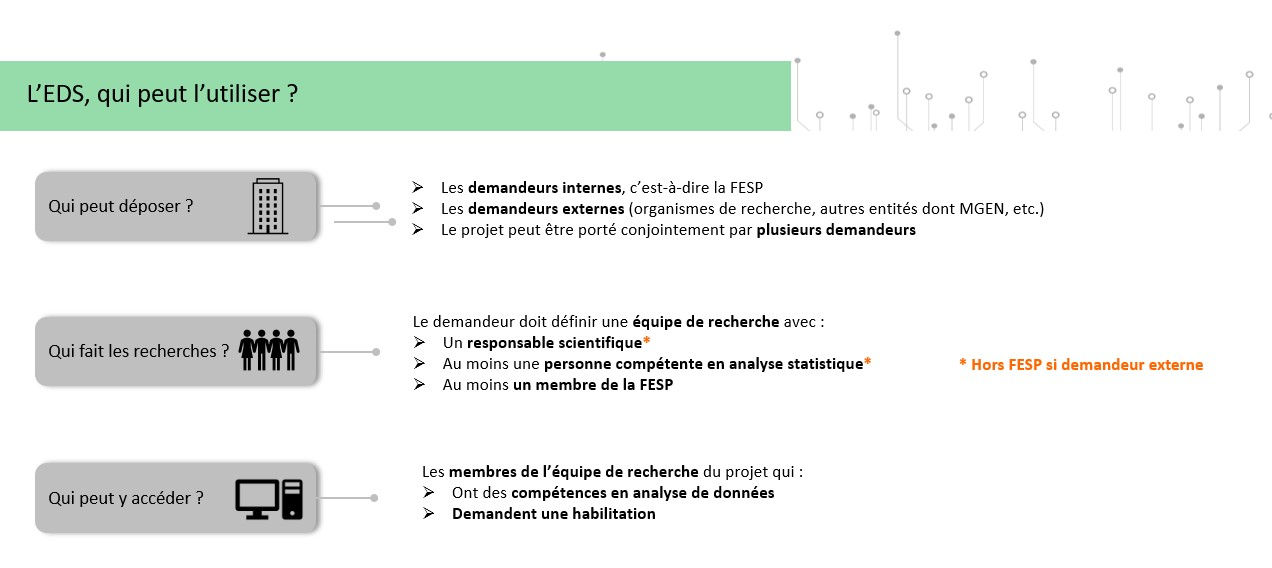 L’EDS peut être utilisé, à des fins de recherche dans un intérêt public, par tout demandeur interne (FESP) ou externe (organismes de recherche, etc.) dont le projet s’inscrit dans la finalité de l’EDS à savoir « étudier le parcours de santé des assurés, en incluant les mesures d’accompagnement dont ils peuvent bénéficier, afin d’identifier des leviers d’action pour améliorer la prévention et la prise en charge de la santé en population ».