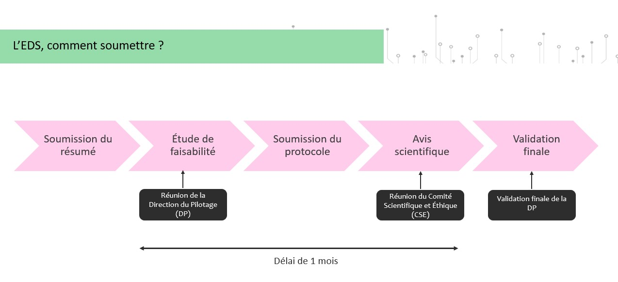 Le demandeur dépose, dans un premier temps, un résumé de son projet dont l’admissibilité sera étudiée par la DP de l’EDS (prochaine séance : mi-mars 2026). Si le projet est jugé admissible, le demandeur sera invité à soumettre un protocole de recherche qui sera étudié par le CSE pour avis scientifique. Une aide au remplissage du protocole est fournie dans le kit de soumission. C’est à la DP que revient la décision finale.